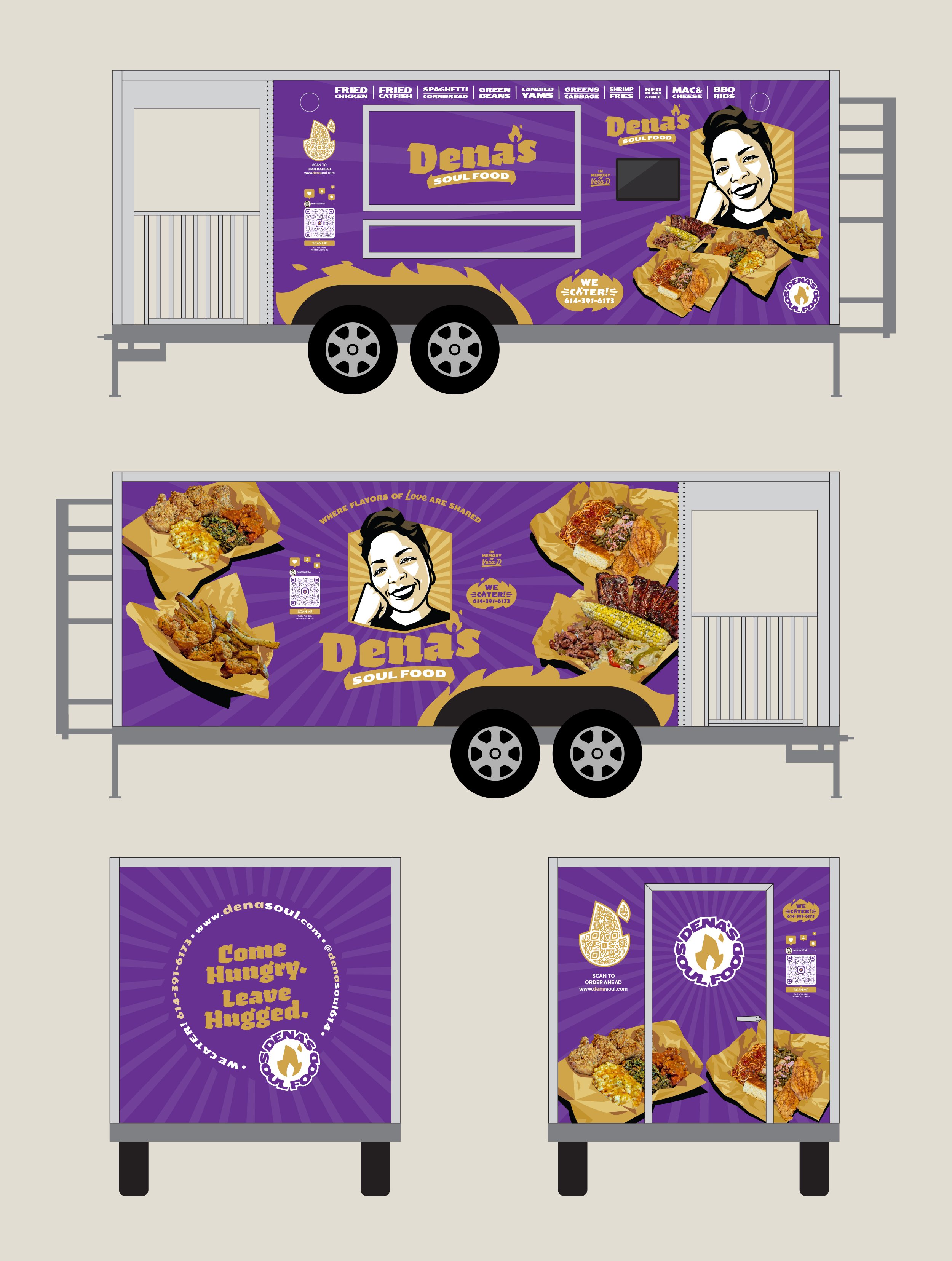 Dena’s Soul Food is a North Carolina–based food truck rooted in Chicago family recipes passed down through generations. I developed a cohesive brand identity system, color palette, and typography that balances heritage, faith, and approachability. The purple and gold palette references both biblical symbolism and appetite-driven warmth, reinforcing the company’s Christian foundation without overpowering the brand. The system extends across the trailer wrap, menu banner with custom QR integration, and an in-progress website designed for clarity and ease. The result is a startup brand that feels soulful, intentional, and built to travel.